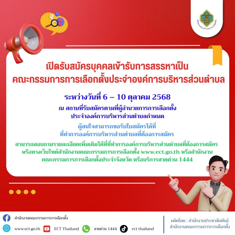 ประชาสัมพันธ์เปิดรับสมัครบุคคลเข้ารับการสรรหาเป็นคณะกรรมการการเลือกตั้งประจำองค์การบริหารส่วนตำบล
